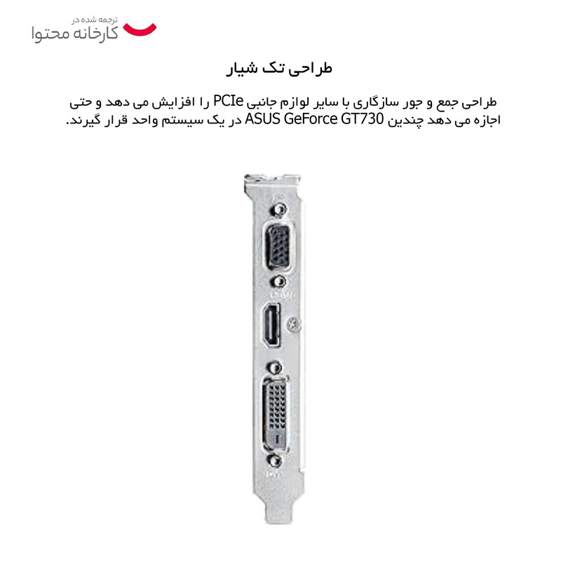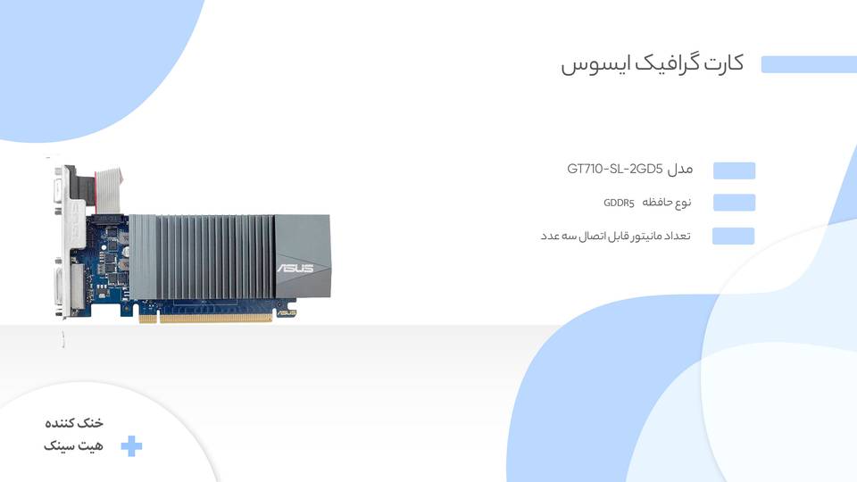 کارت گرافیک «ایسوس» (ASUS) مدل «GT710-SL-2GD5» از پردازندهی گرافیکی GeForce GT 710 شرکت ان ویدیا (NVIDIA) استفاده میکند. هستهی گرافیکی این محصول با حداکثر فرکانس 954 مگاهرتز کار میکند. دو گیگابایت حافظهی گرافیکی GDDR5 با پهنای باند 64 بیت در این محصول به کار رفته که فرکانس موثر آن 5012 مگاهرتز است. برای خنکسازی کارت گرافیک از یک هیتسینک غیرفعال (Passive) استفاده شده که فاقد فن است و به همین دلیل، هیچ نویزی تولید نمیکند. خروجیهای تصویر GT710-SL-2GD5شامل یک پورت HDMI یک درگاه VGA و یک پورت DVI-D هستند. بنابراین، می توانید از این کارت گرافیک 3 خروجی بگیرید. کارتهای گرافیکی ایسوس تحت فناوری Auto-Extreme تولید میشوند. مقصود از این فناوری، دخالتنکردن انسان در پروسهی تولید است و تمام پروسههای ساخت به صورت اتوماتیک و تماما ماشینی انجام میشود. برای استفاده از چنین کارت گرافیکی، حداقل به یک پاور 75 واتی نیاز خواهید داشت. کارت گرافیکی GT710-SL-2GD5 برای سیستمهای کامپیوتری جمعوجور سینمای خانگی یا کامپیوترهای اداری، انتخاب خوبی خواهد بود.