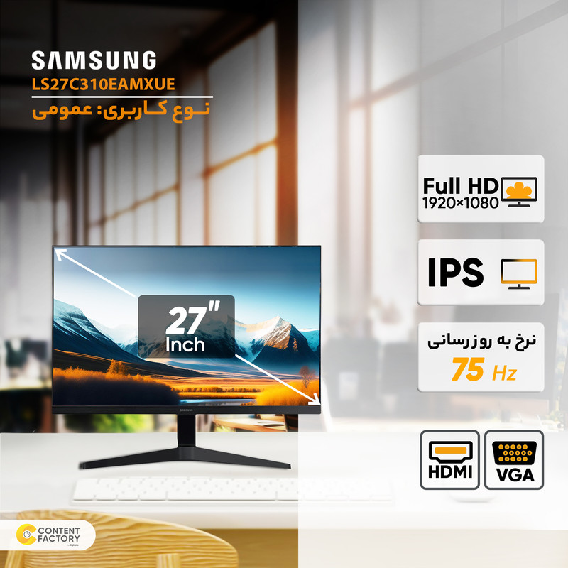 در این مقاله به بررسی مانیتور سامسونگ مدل LS27C310EAMXUE با نمایشگر ۲۷ اینچ میپردازیم. این مانیتور درگاههای ارتباطی VGA و HDMI را در خود میبیند و نرخ بروزرسانی تصویر آن ۷۵ هرتز است. همچنین از پنل IPS در این مانیتور استفاده شده است و قابلیت اتصال پایه دیواری VESA هم در این مانیتور وجود دارد.