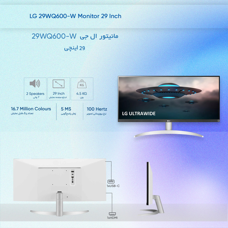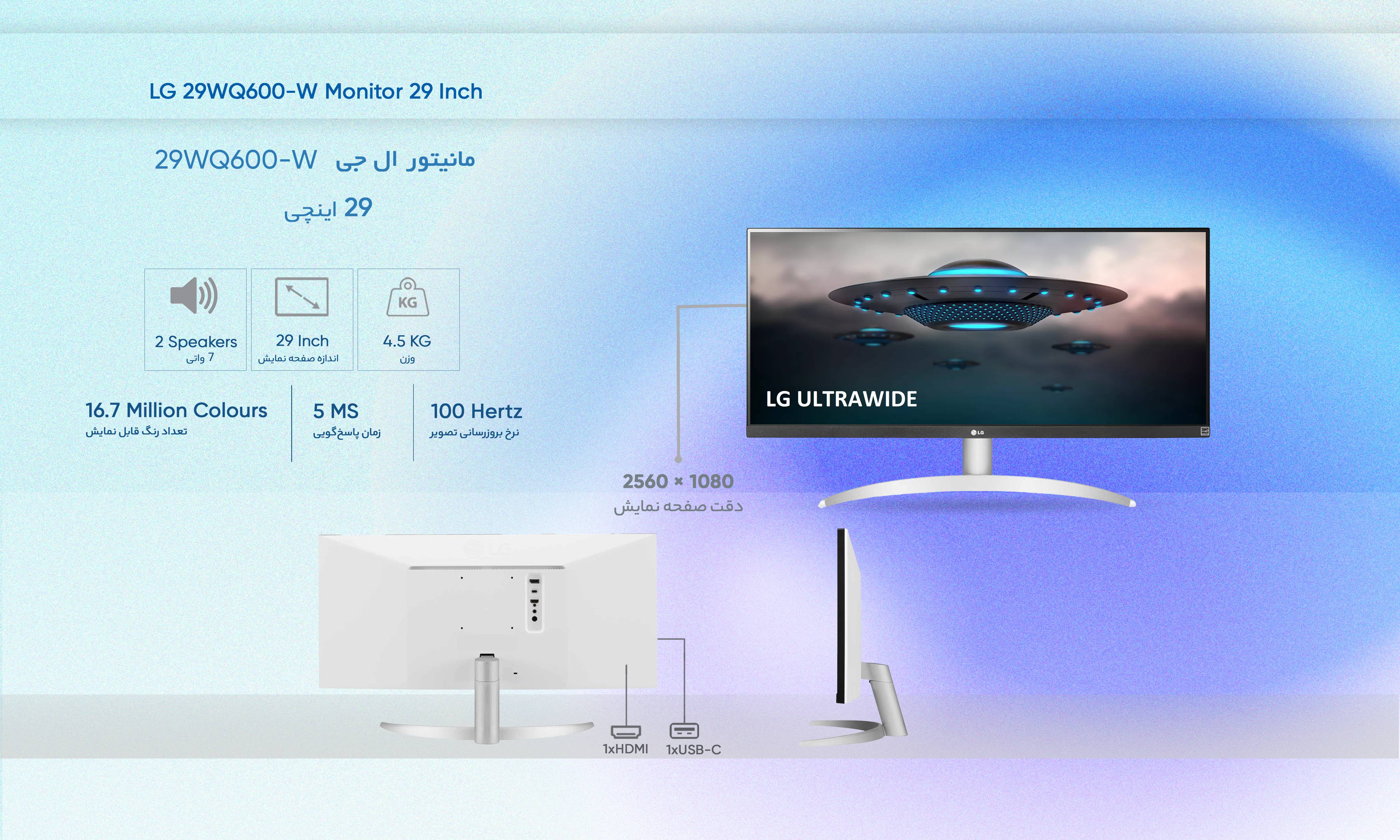 مانیتور ال جی مدل 29WQ600-W سایز 29 اینچ، رزولوشن Full HD، پنل IPS، نرخ بروزرسانی تصویر 100 هرتز، نسبت تصویر 21:9-Ultra Wide، یک پورت HDMI و یک پورت DisplayPort و یک پورت USB-C