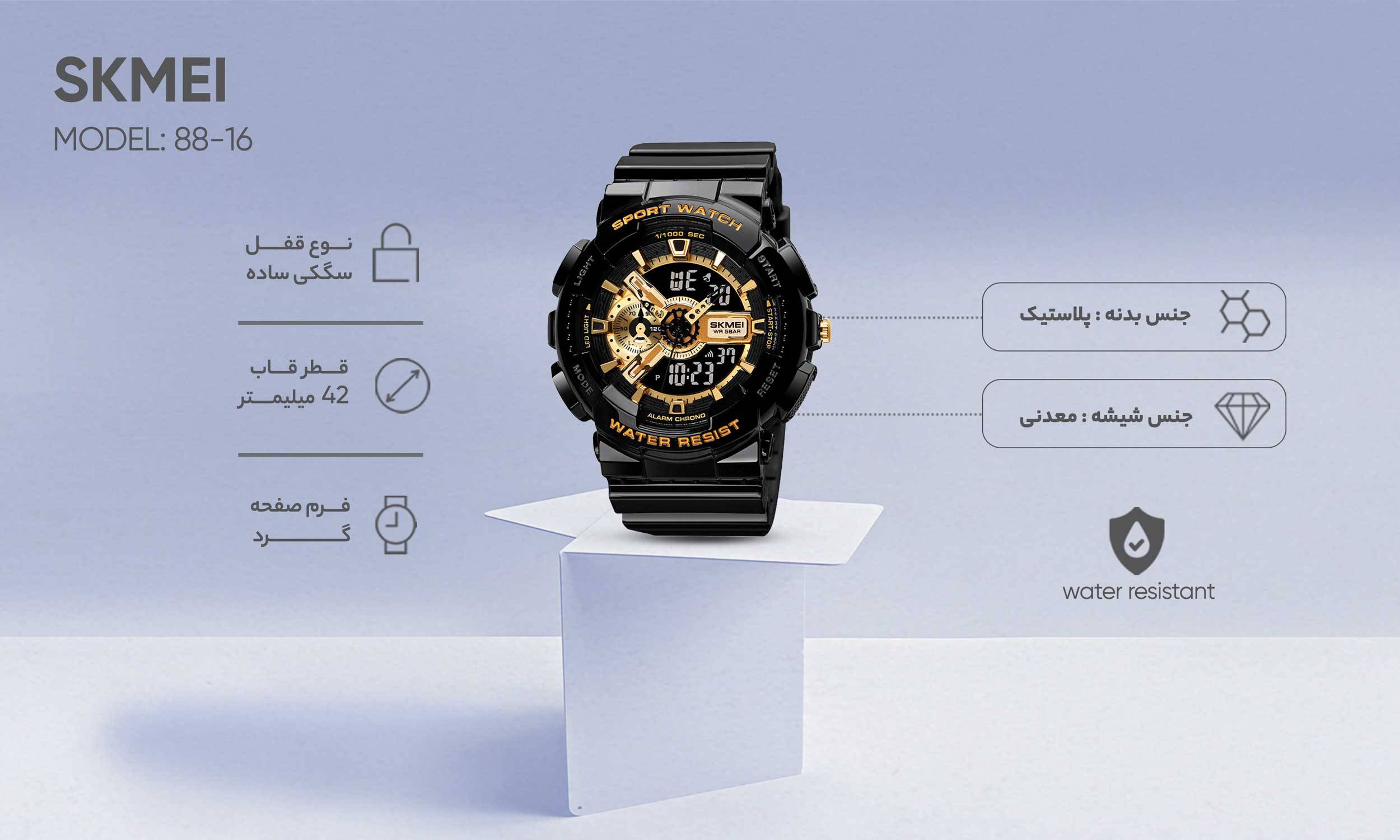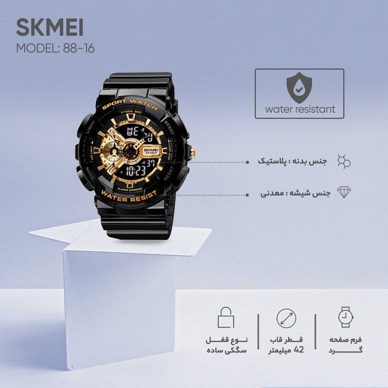 از پرطرفدارترین اکسسوریهای مردانه و زنانه، ساعتهای مچی هستند که در انواع مختلف عقربهای و دیجیتال در بازار عرضه میشوند. معمولا ساعتهای مچی دارای تاریخشمار روز، ماه و سال نیز هستند که در دو نوع مکانیکی و کوارتز وجود دارند. ساعت مچی دیجیتال اسکمی مدل 88-16 کد 01 دارای موتور کوارتز بوده، این نوع محصول نیروی مورد نیاز خود را از طریق یک باتری تامین میکنند. این مدل ساعتها در اندازهگیری زمان بسیار دقیق و قابل اعتماد بوده و درصد خطای آنها کمتر از انواع دیگر است. ساعت مچی دیجیتال اسکمی مدل 88-16 کد دارای قطر قاب 51 است، این ساعت دارای جنس بدنه پلاستیکی بوده و قابل استفاده برای خانمها و آقایان است. جنس شیشه این محصول نیز معدنی بوده و دارای نور پسزمینه است. این ساعت عقربهای مردانه دارای ظاهری شیک و جذاب بوده و برای استفاده روزمره کاملا مناسب خواهد بود.